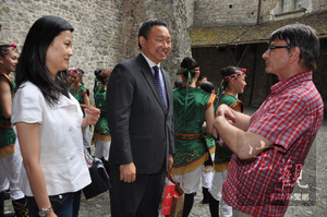 瑞士日內瓦湖畔藝文風氣盛,台灣方相舞蹈團首度在湖畔與著名西雍古堡表演,幕後推手日內瓦辦事處長余大雷(中)前往古堡,肯定文化外交。